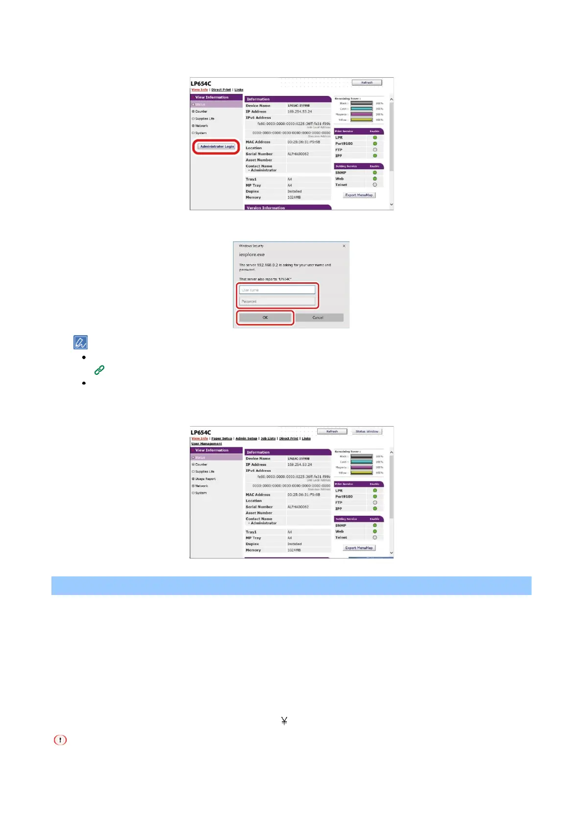the web page is used to log into this machine or to change settings from the operator panel or web page.