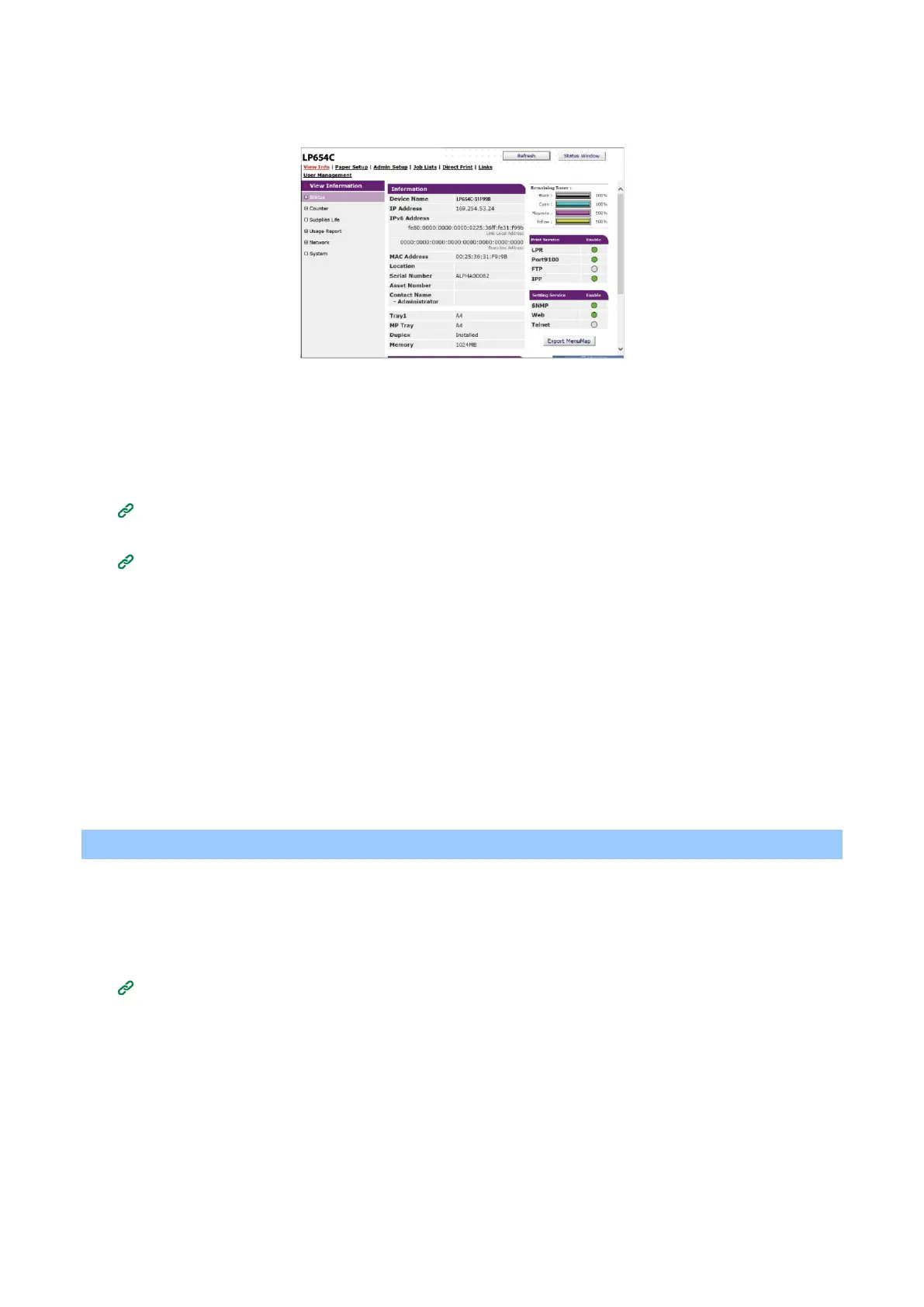 You can check the supplies life, print statistics, and network and system information of this machine.