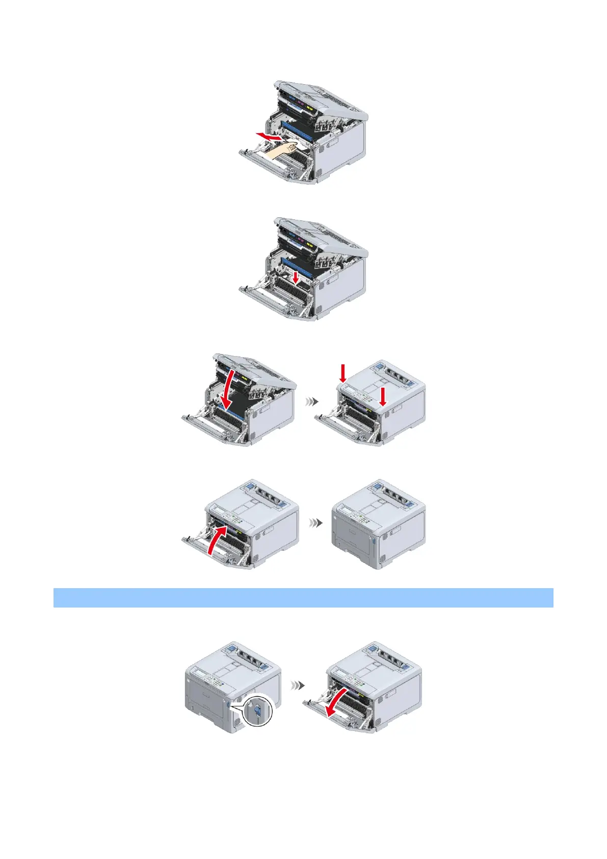 Pull the front cover open lever (blue) to open the front cover.