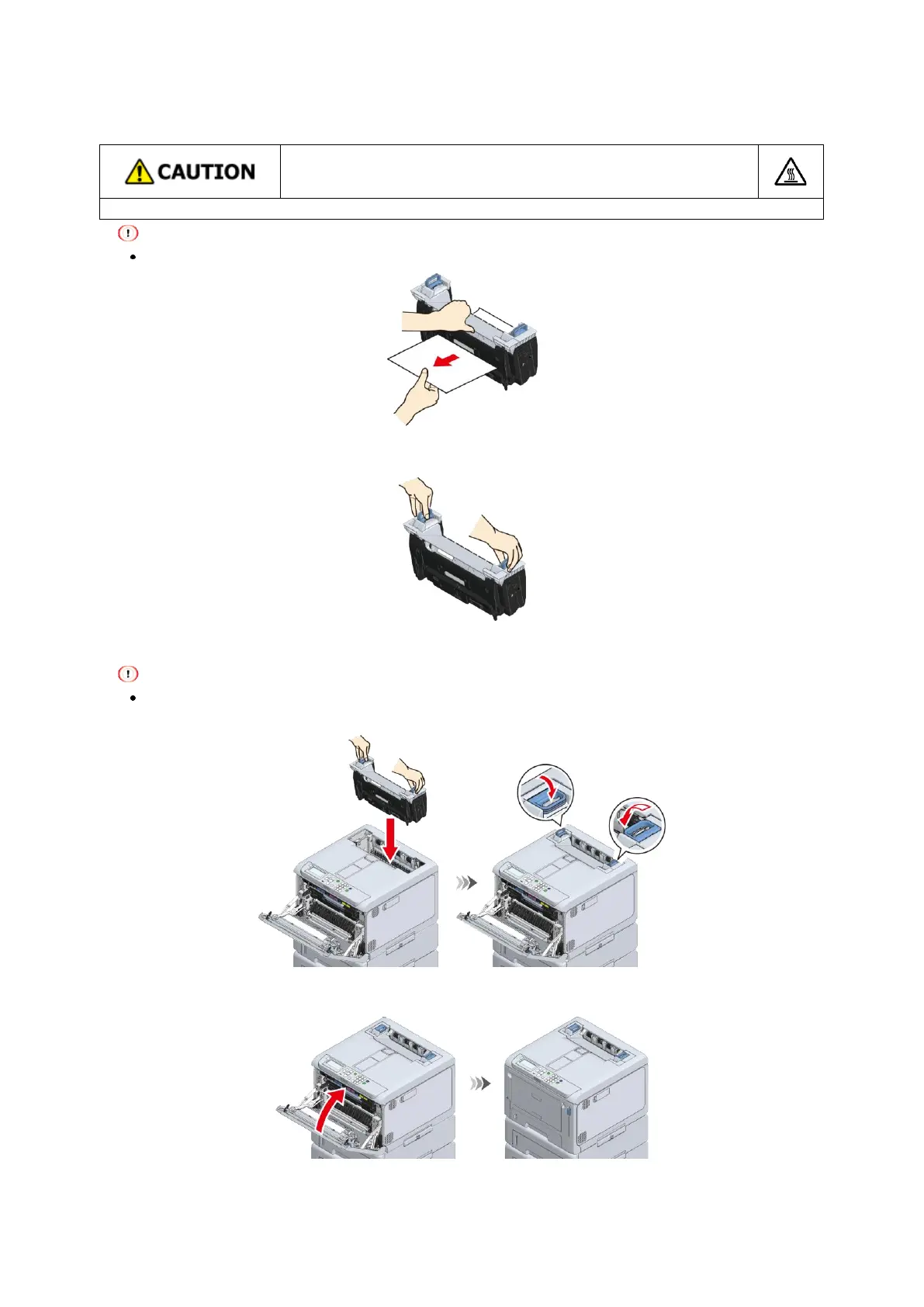 Make sure that the fuser unit does not float from the top of the output tray. If floating, the fuser unit will not be