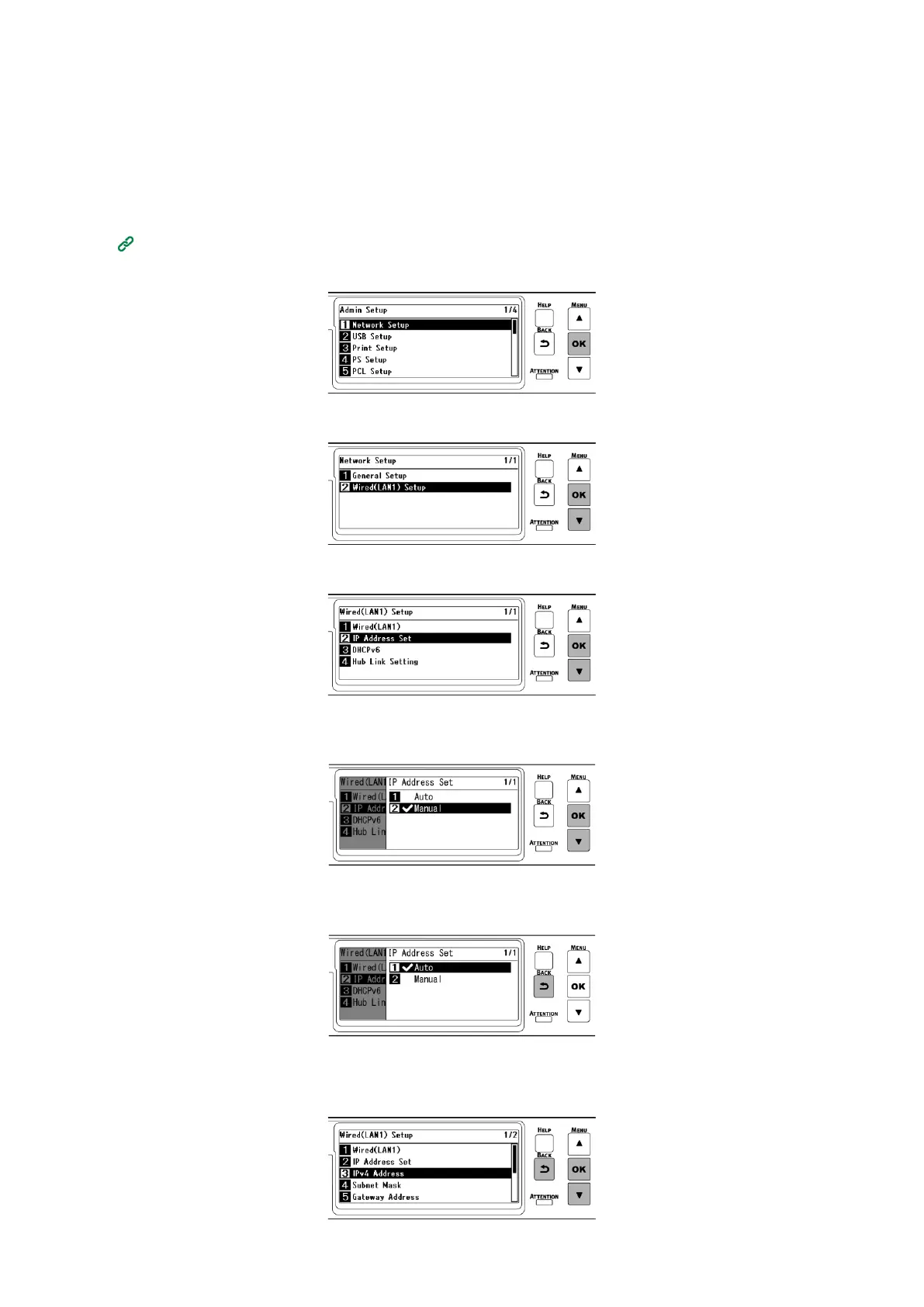 Press «BACK», then press ▼ to select [IPv4 Address] on the [Wired(LAN1) Setup] screen, and