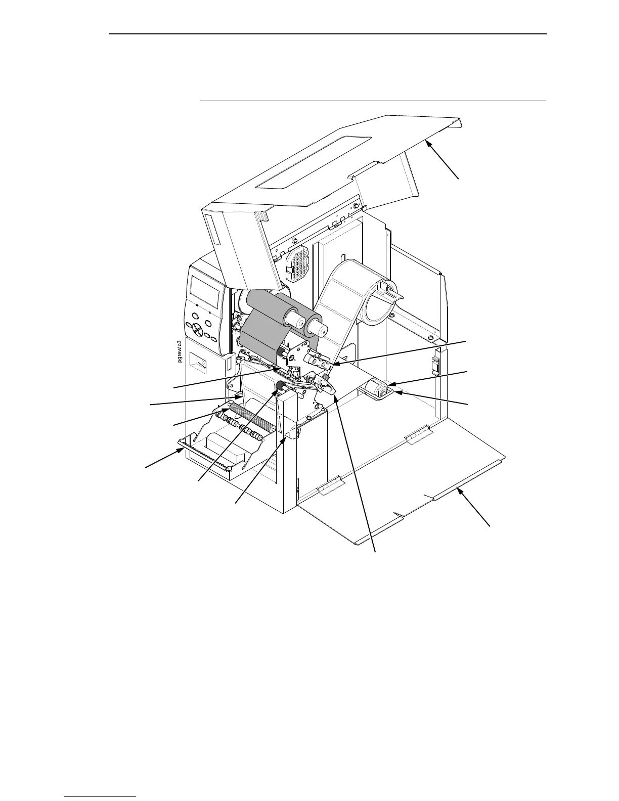 2. Open the side cover and refer to the Label and Ribbon Routes label on