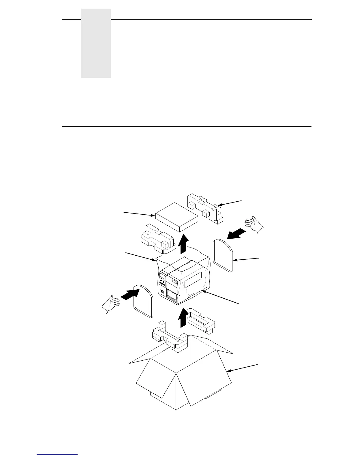 The printer is shipped in a carton and protective bag. The top lid of the carton