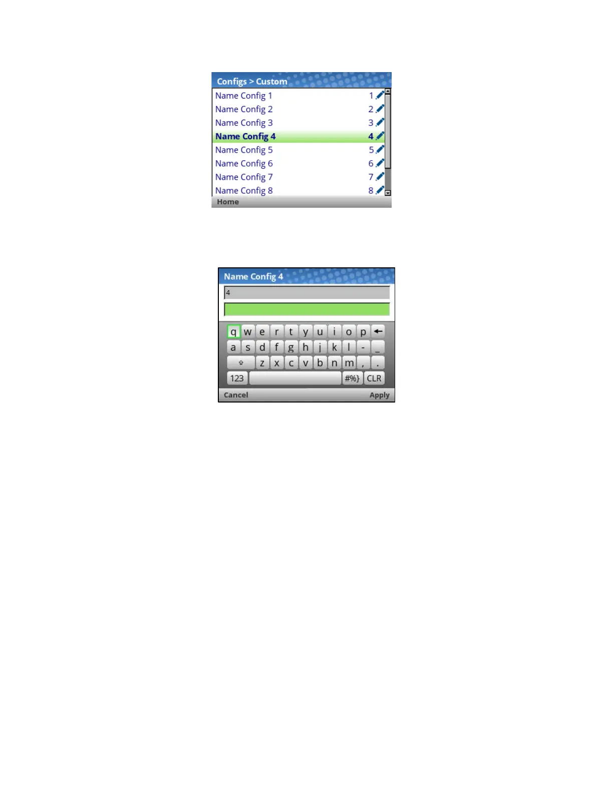 When a configuration to name is selected, a virtual keyboard will be provided for the user to enter the
