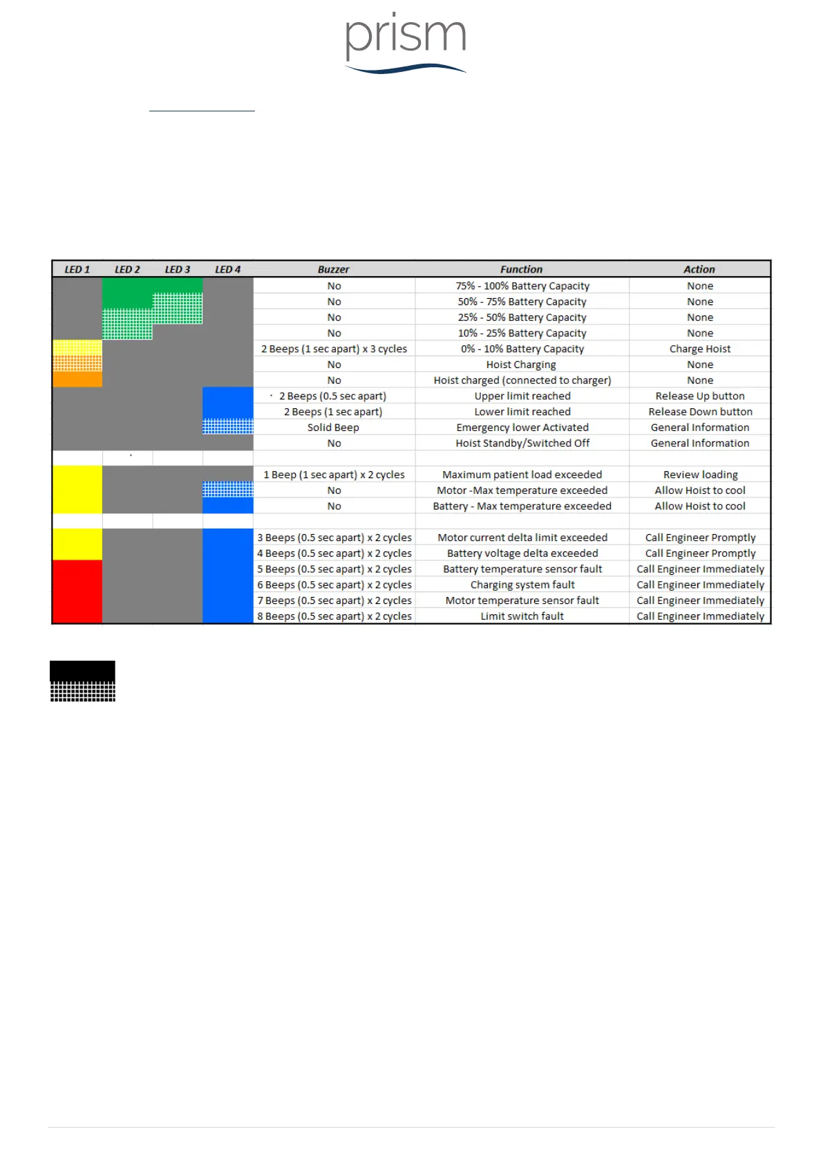 Should a problem arise with the use of the Hoist review the table below gives an indication as to the status of the device through