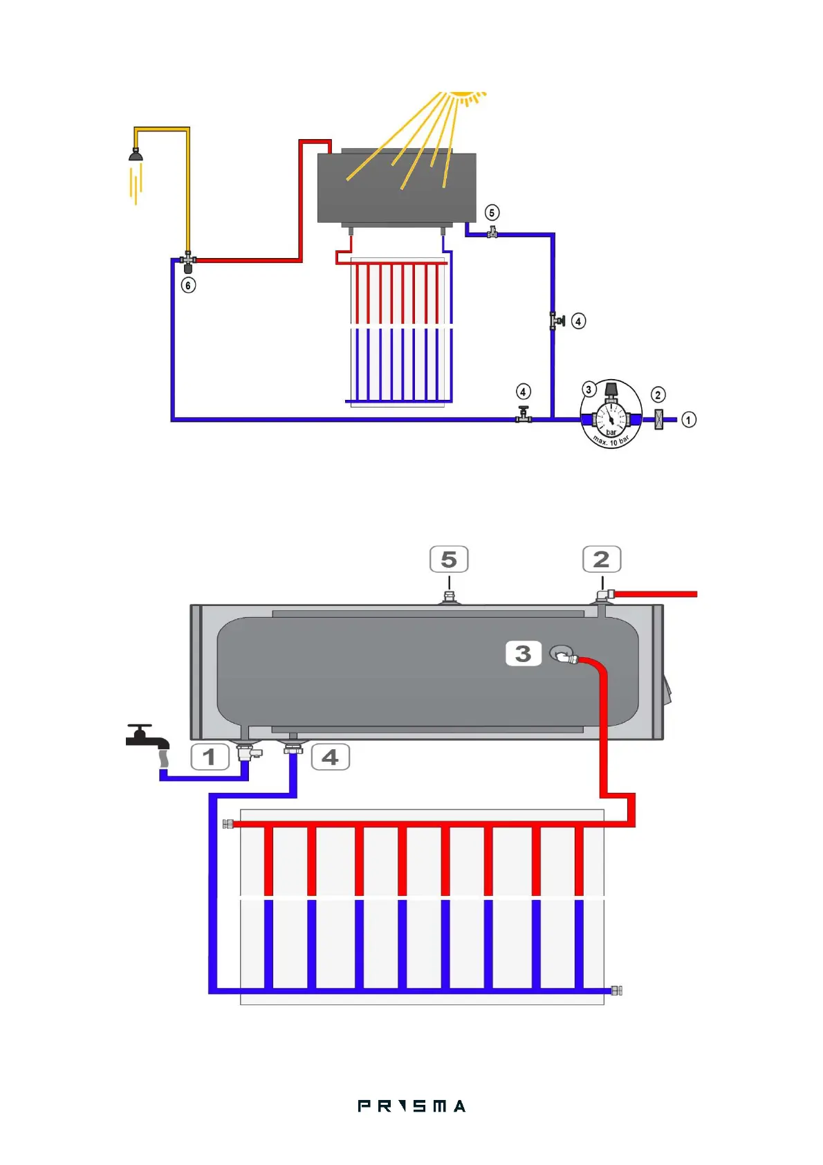 Figure 4: Thermosiphonic system layout and connections. [1] Domestic cold water supply, 10bar