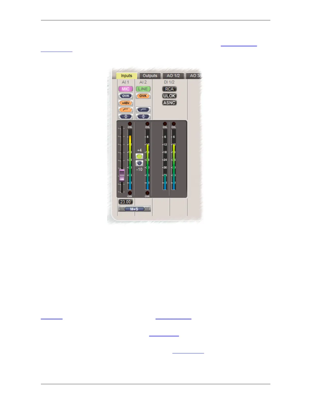 The Inputs tab contains the controls and status indicators for all functions of the analogue inputs and