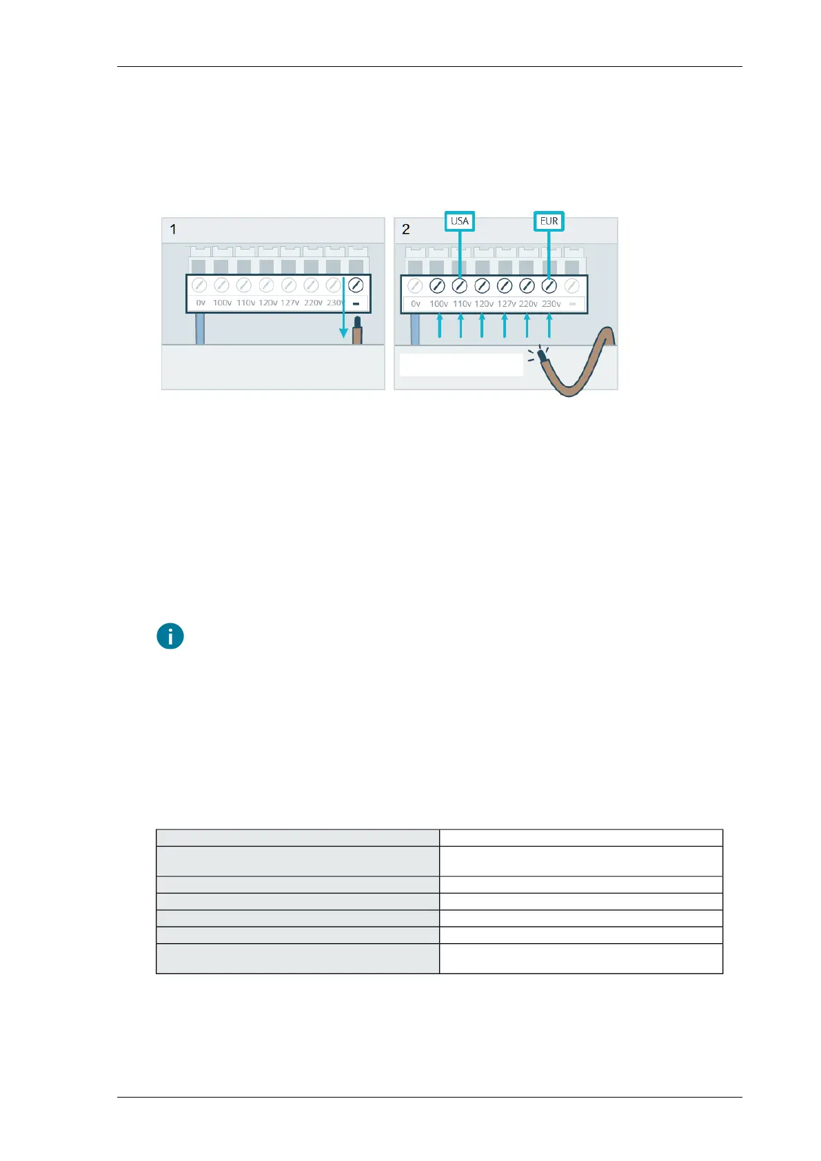 4. Connect the phase wire to the terminal that corresponds to the local mains voltage.