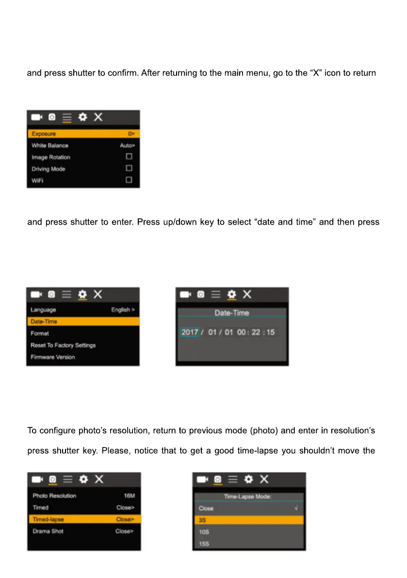 To configure the camera into time-lapse mode, enter in setting menu and then select