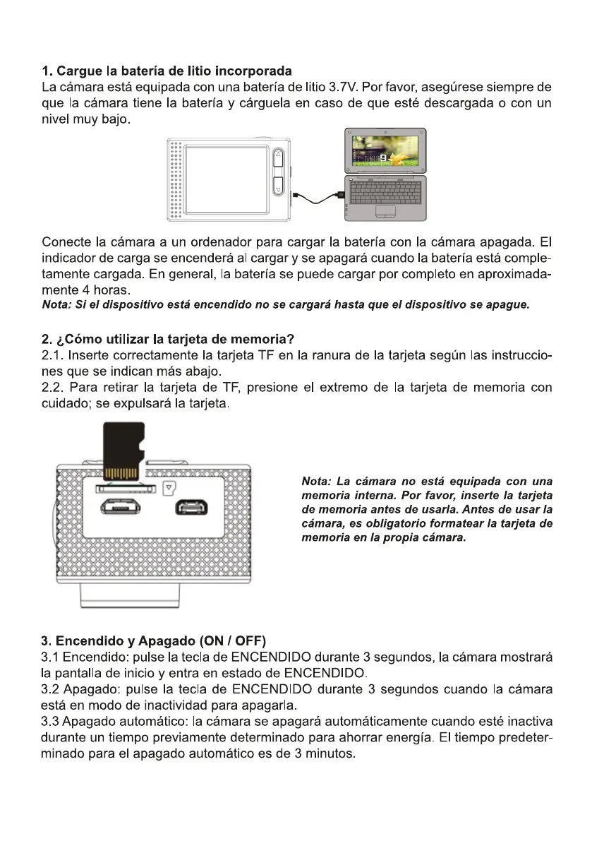 PRIXTON DV660 - First steps; Charge the built-in lithium battery; How to use the memory card; Startup and shutdown