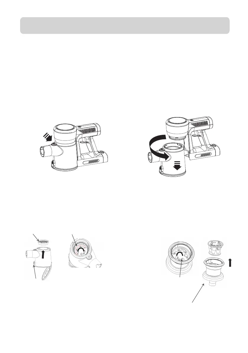 pressione o botão do depósito de pó vazio. Levante a pega do filtro do cone ciclónico e rode