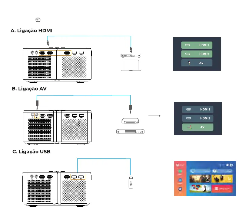 Prima (Fonte ) no projetor ou no comando para aceder à interface da Fonte de Entrada.