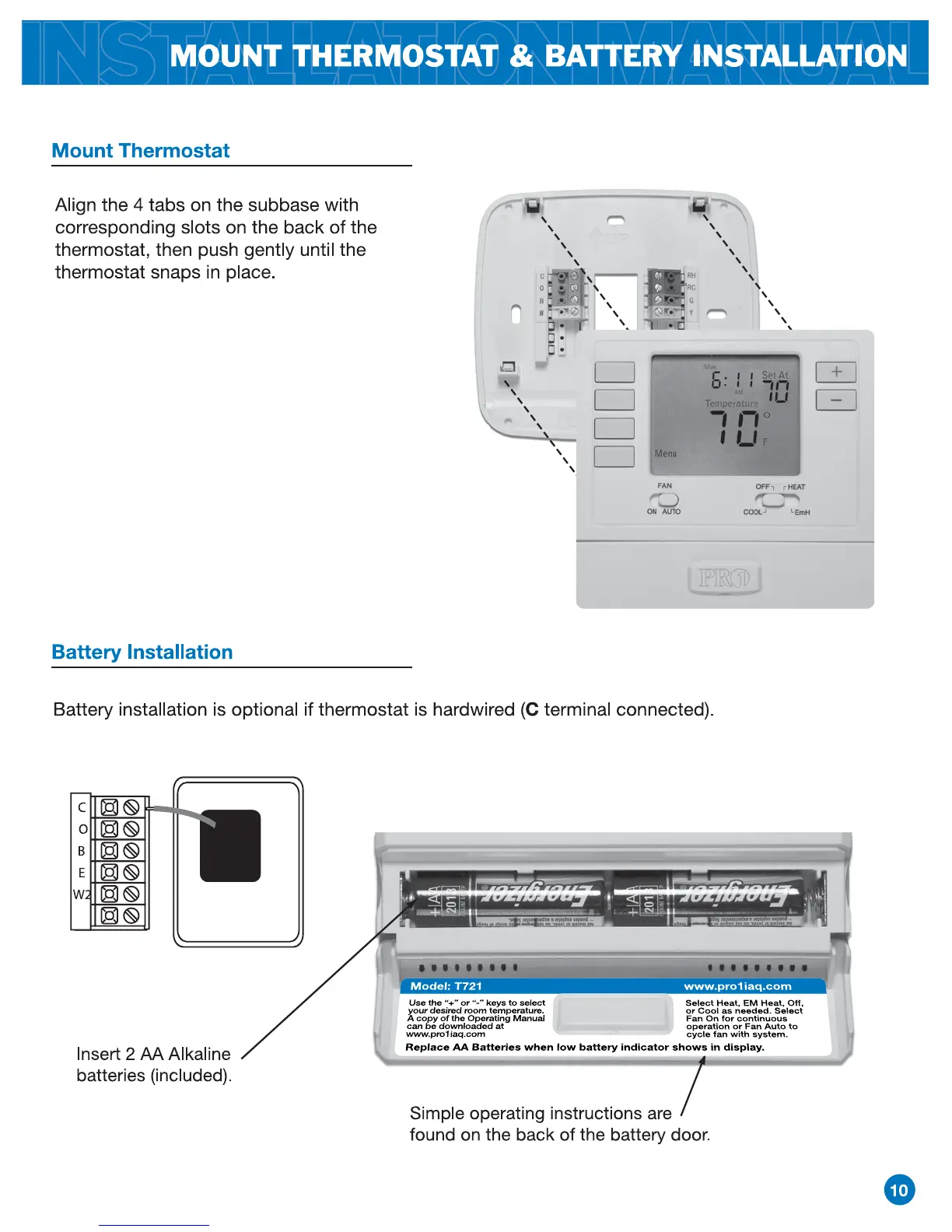 Pro 1 IAQ T721 - Mount Thermostat; Battery Installation