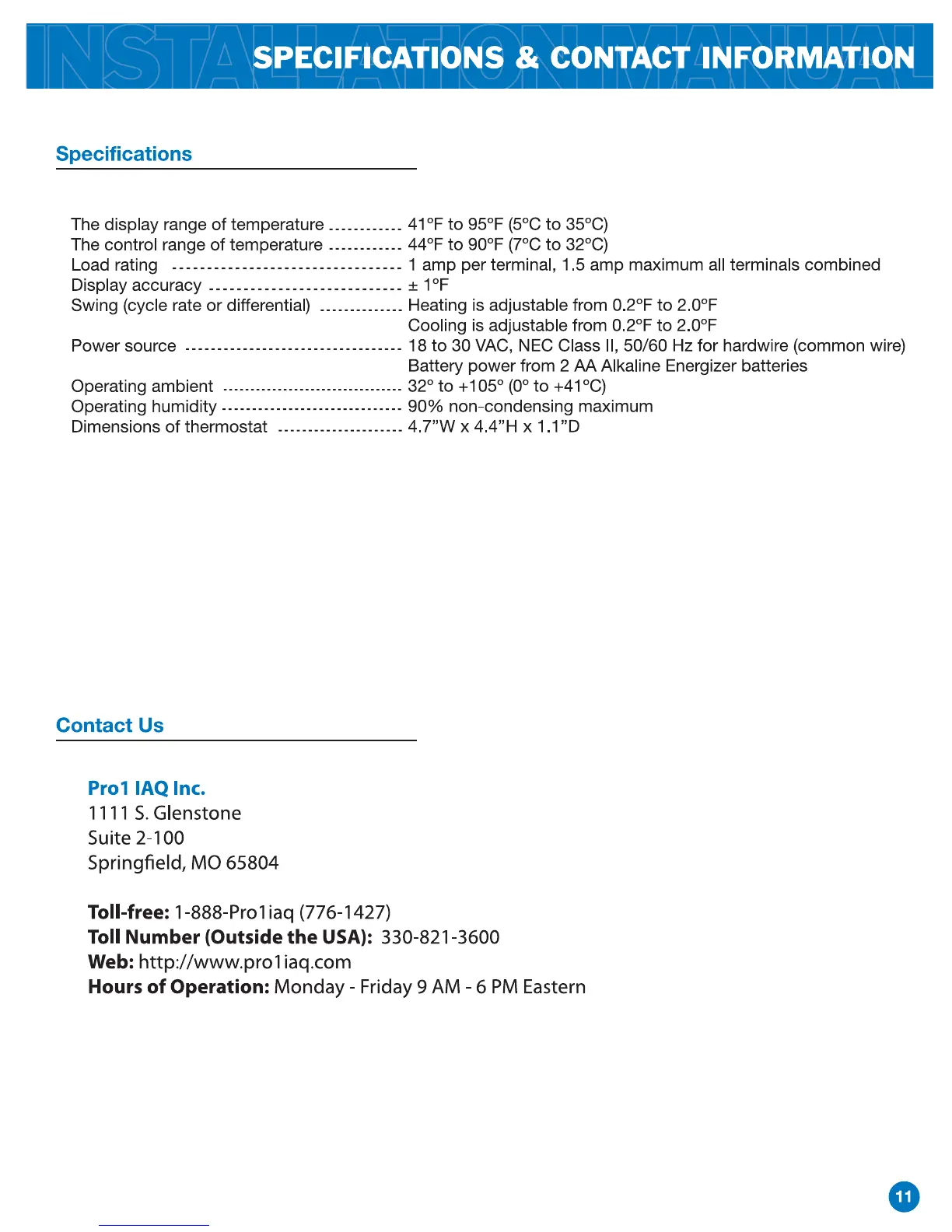 Pro 1 IAQ T721 - Specifications; Contact Us