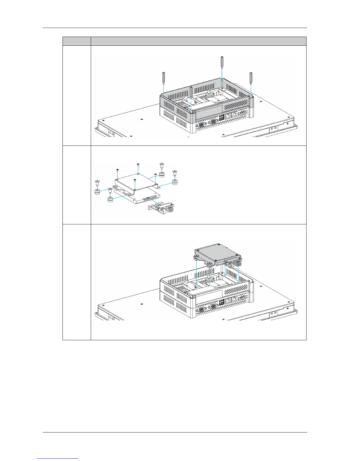 5 Install the 2.5" SATA HDD/SSD on the HDD/SSD bracket. Screw in the 4 screws on the side of