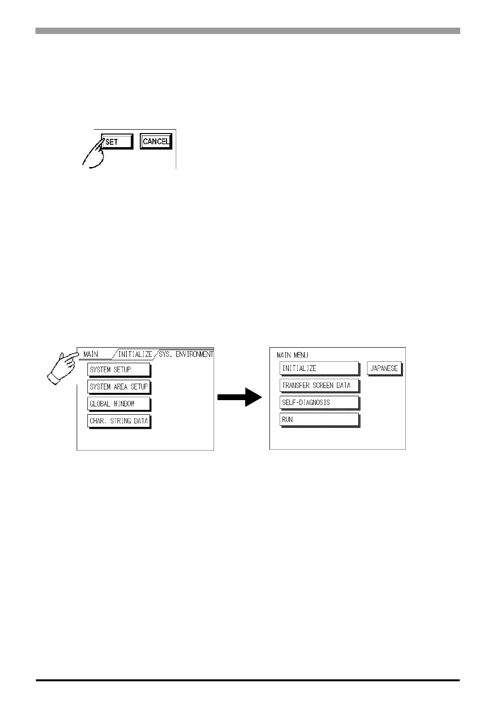 E.g. To return to the MAIN MENU from the SYS.ENVIRONMENT screen, simply touch the MAIN MENU