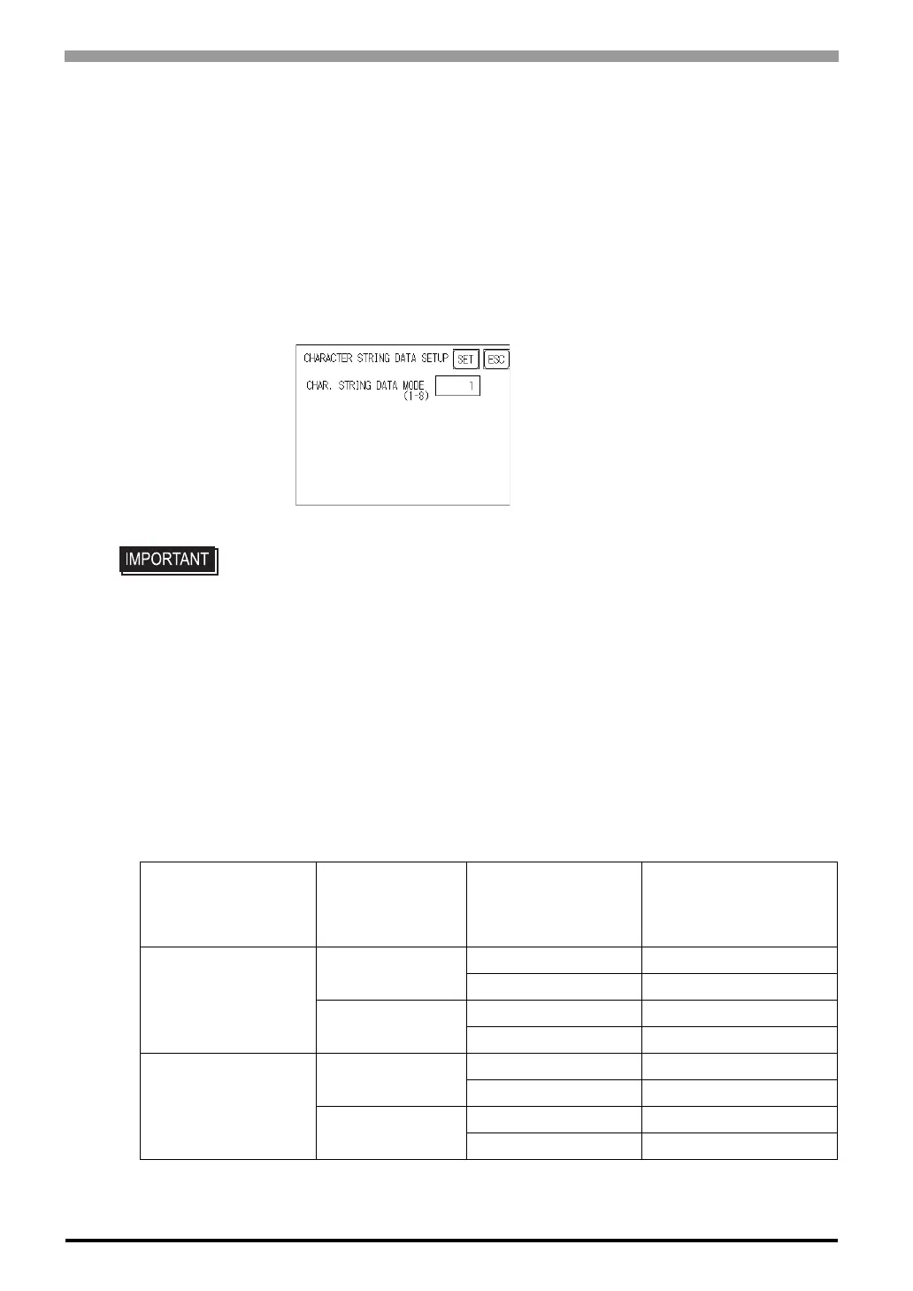 • Setup the Character String Data mode to match the PLC type. Device type and