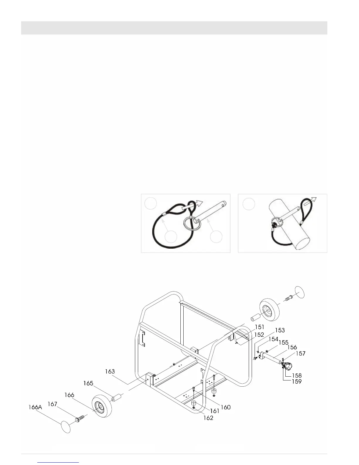 3.Slide M10 x 75 bolt (item 167) through the wheel (item 166), then through the wheel bracket on the carrier, with the offset side of the