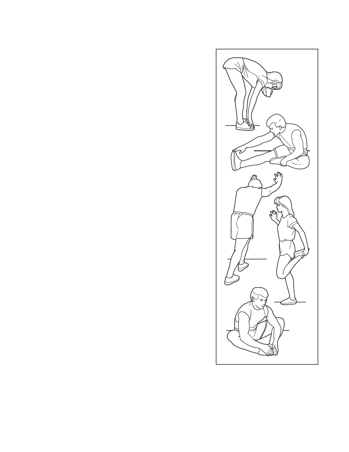 The correct form for several basic stretches is shown at the right. Move slowly as you stretch; never bounce.