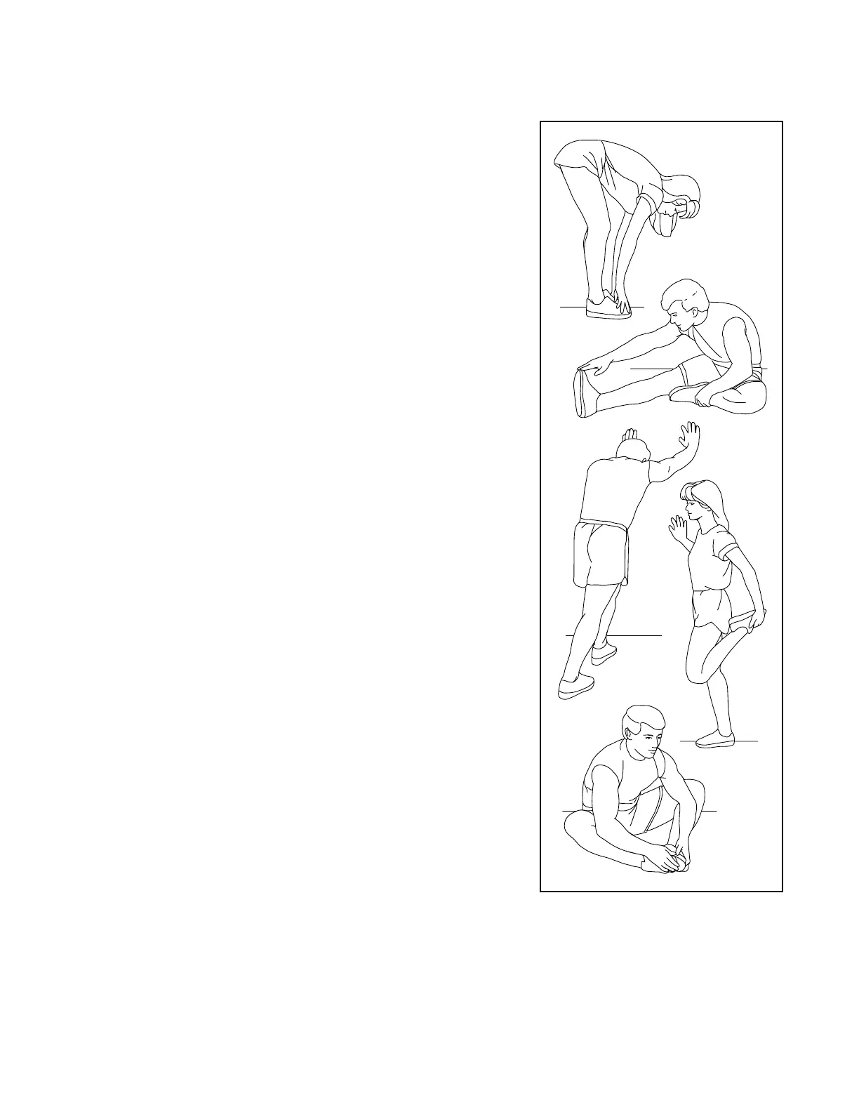 The correct form for several basic stretches is shown at the right. Move slowly as you stretch —never bounce.