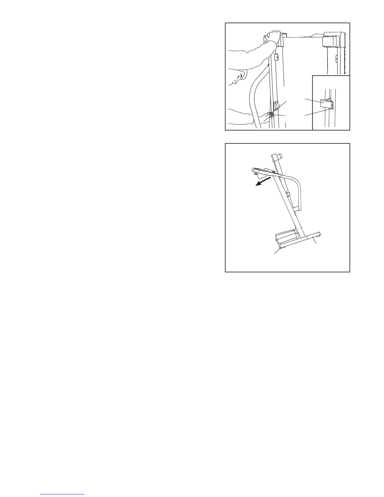 left. Pivot the treadmill down until the frame and foot rail are past the storage latch.