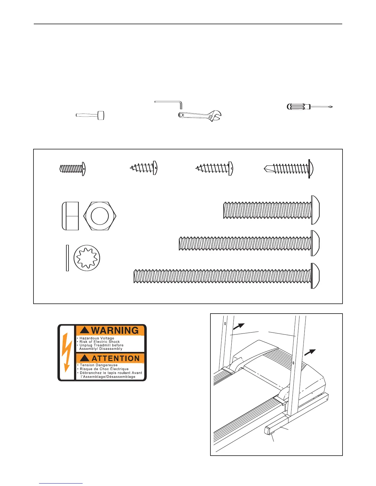 Assembly requires two persons. Set the treadmill in a cleared area and remove all packing materials. Do not
