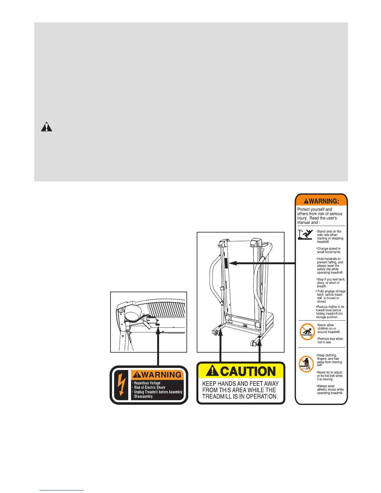 The decals shown have been placed on your treadmill. If a decal is missing, or if it