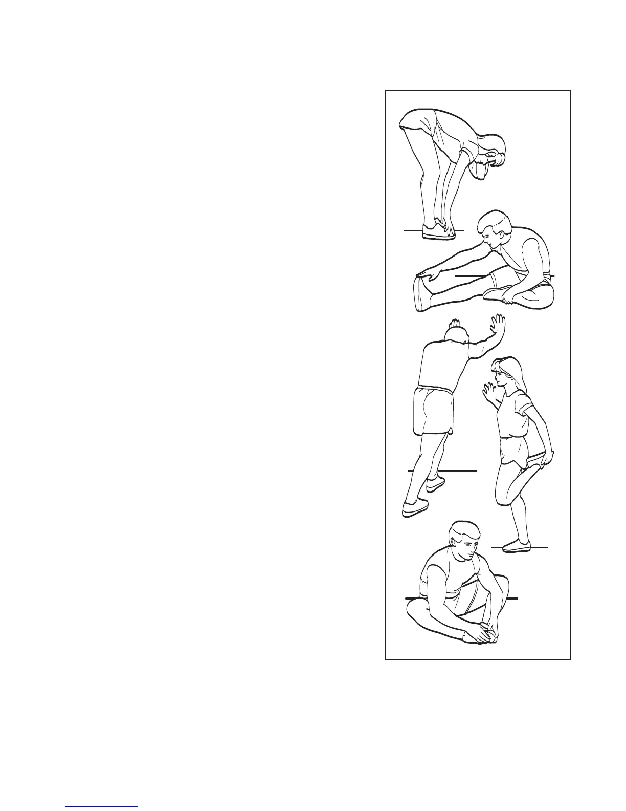 he correct form for several basic stretches is shown at the right. Move slowly as you stretch—never bounce.