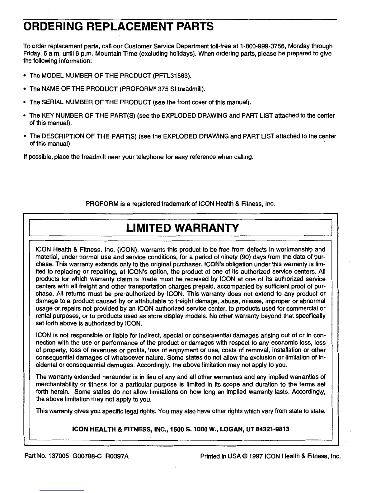 Pro-Form 375 Si - Ordering Replacement Parts