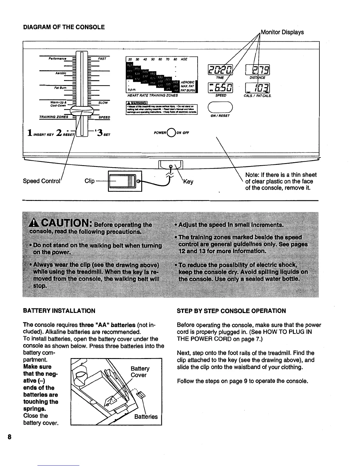 Pro-Form 375e - Console Operation Fundamentals; Console Diagram and Controls; Battery Installation and Console Safety; Initial Console Power-Up