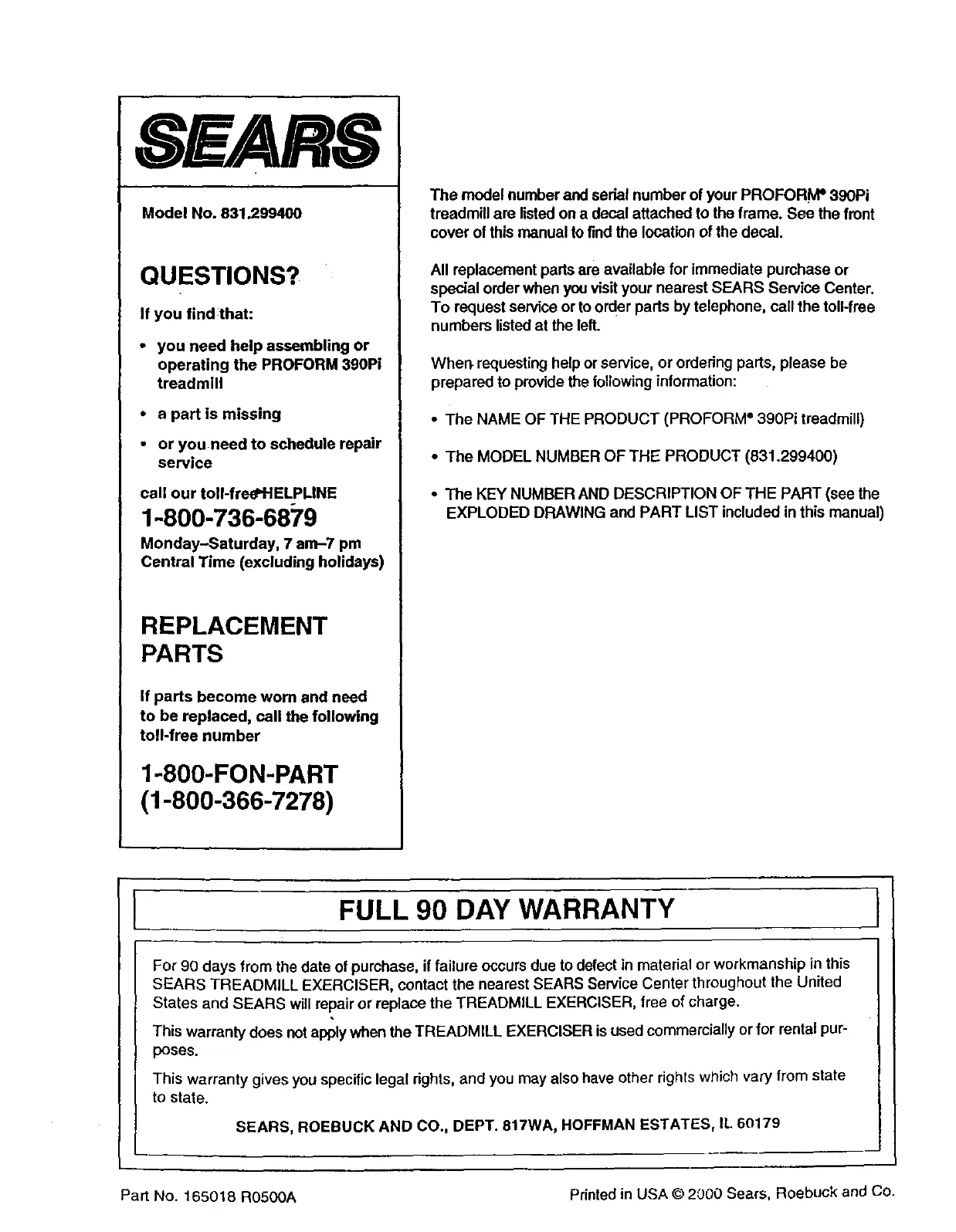 Part No. 165018 R0500A Printed in USA © 2000 Sears, Roebuck and Co.
