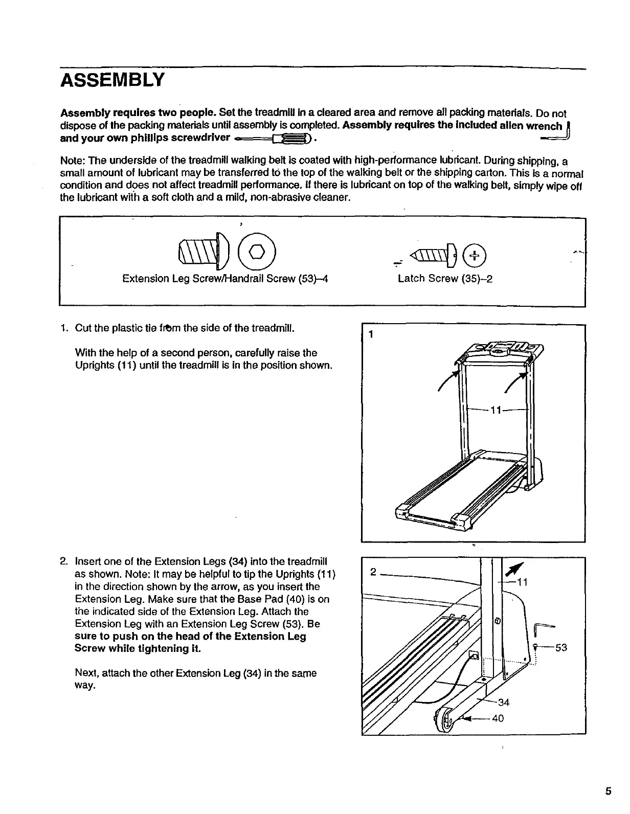 Assembly requires two people. Set the treadmill In a cleared area and remove all packing materials. Do not