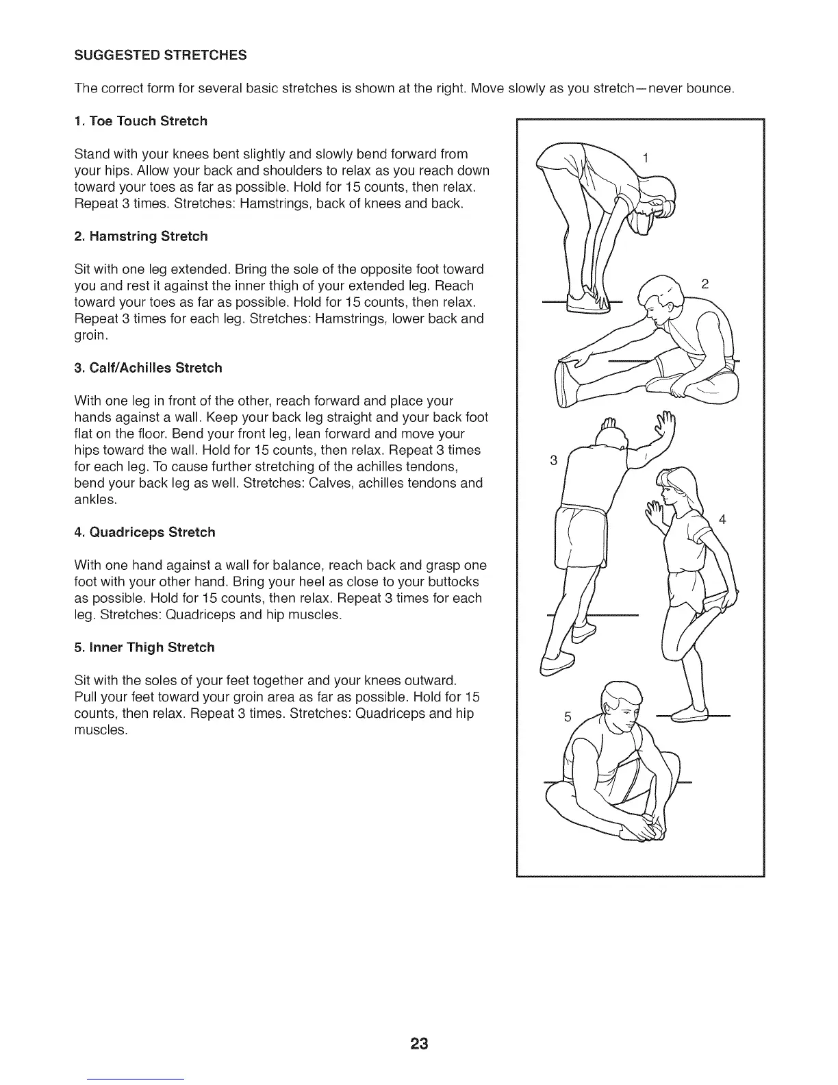 The correct form for several basic stretches is shown at the right. Move slowly as you stretch--never bounce.