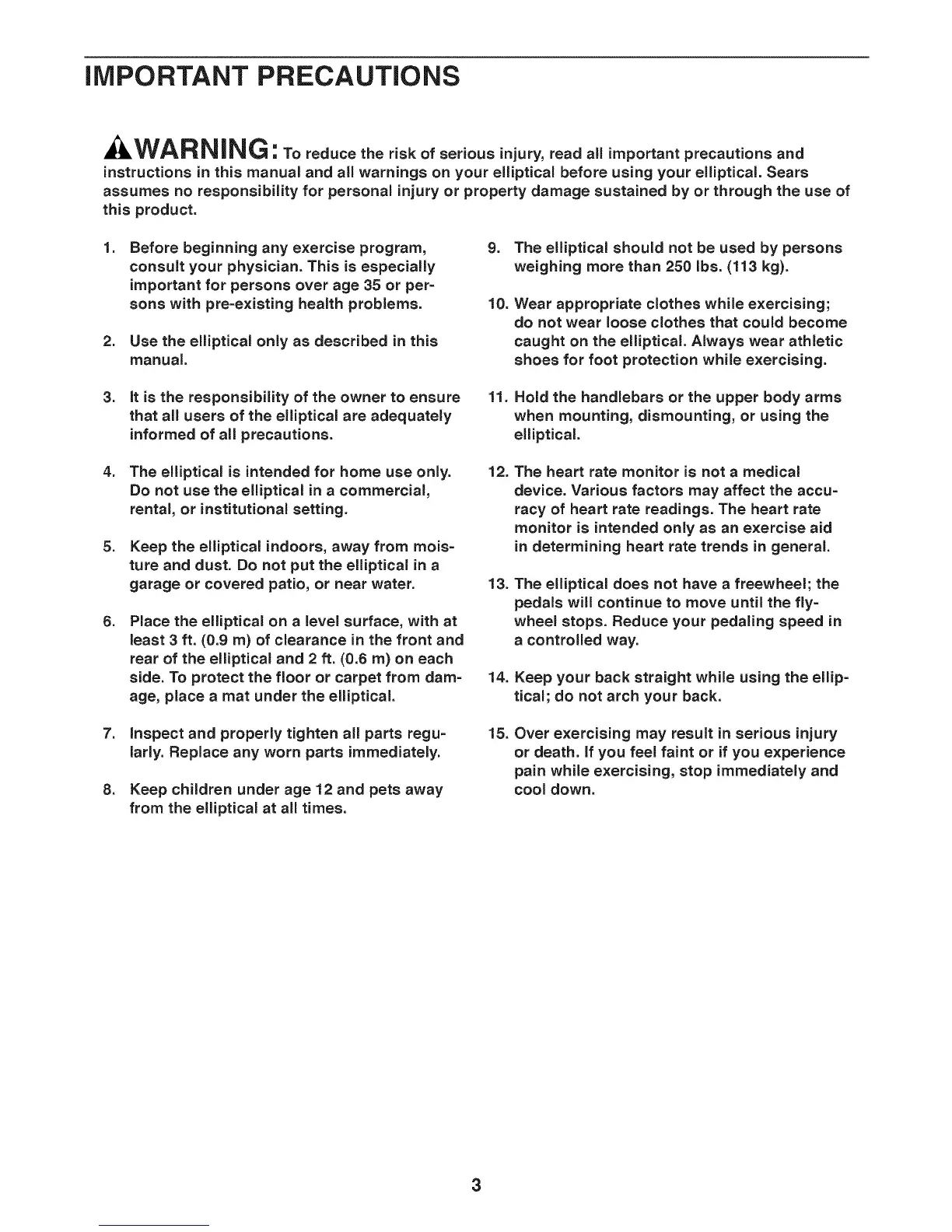 instructions in this manual and all warnings on your elliptical before using your elliptical. Sears