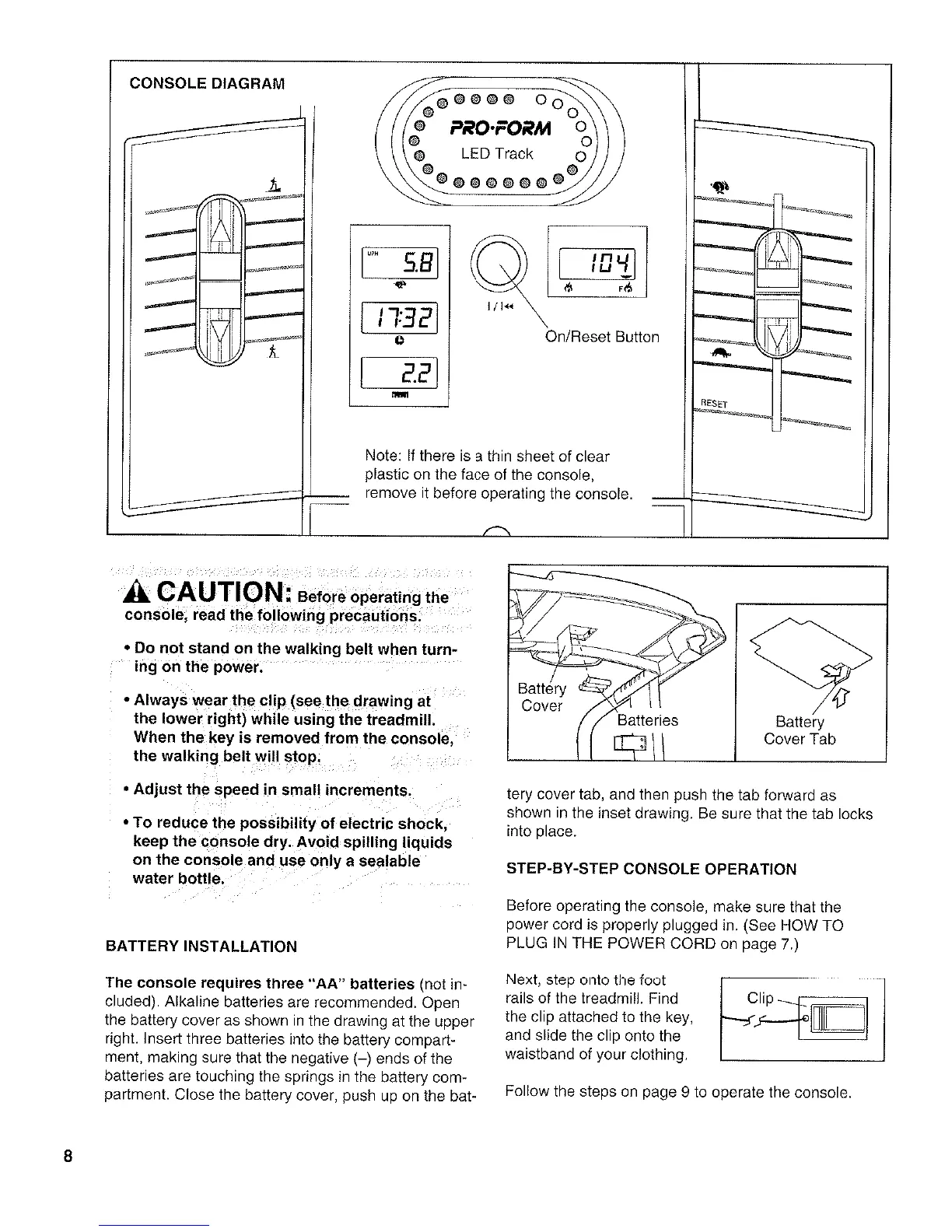 Pro-Form 435ex Treadmill - Console Diagram; Caution; Battery Installation; Step-by-Step Console Operation
