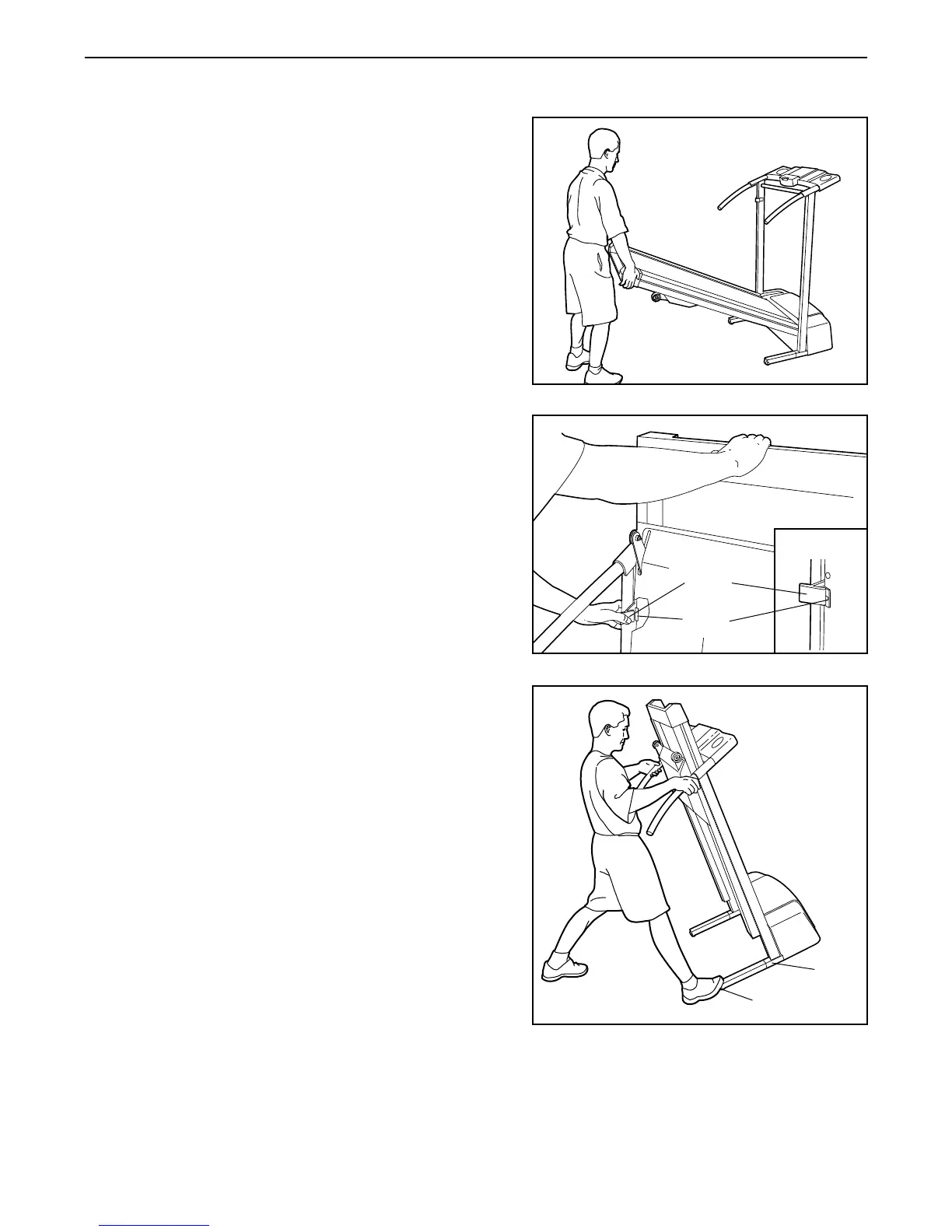 storage latch and hold it. Pivot the treadmill down until the frame and foot rail are past the storage latch.