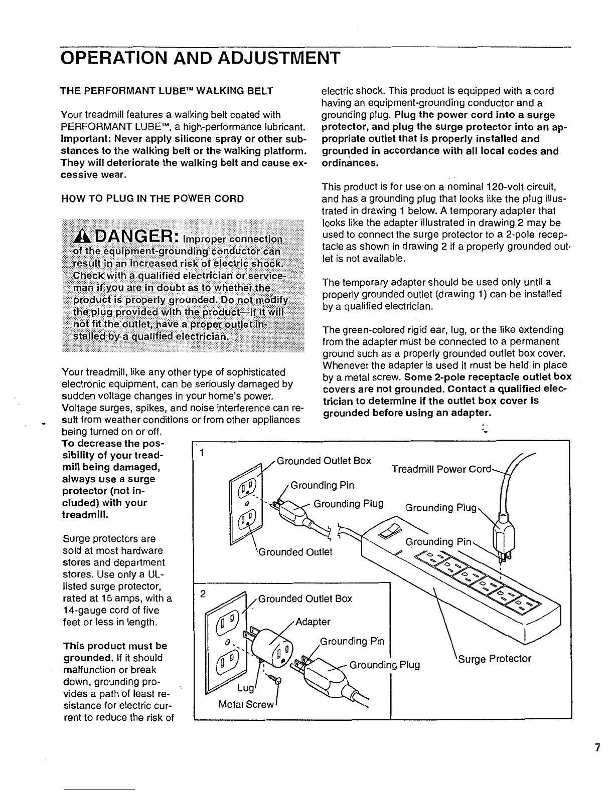 Pro-Form 585 TL - OPERATION AND ADJUSTMENT; Power Cord Connection and Safety