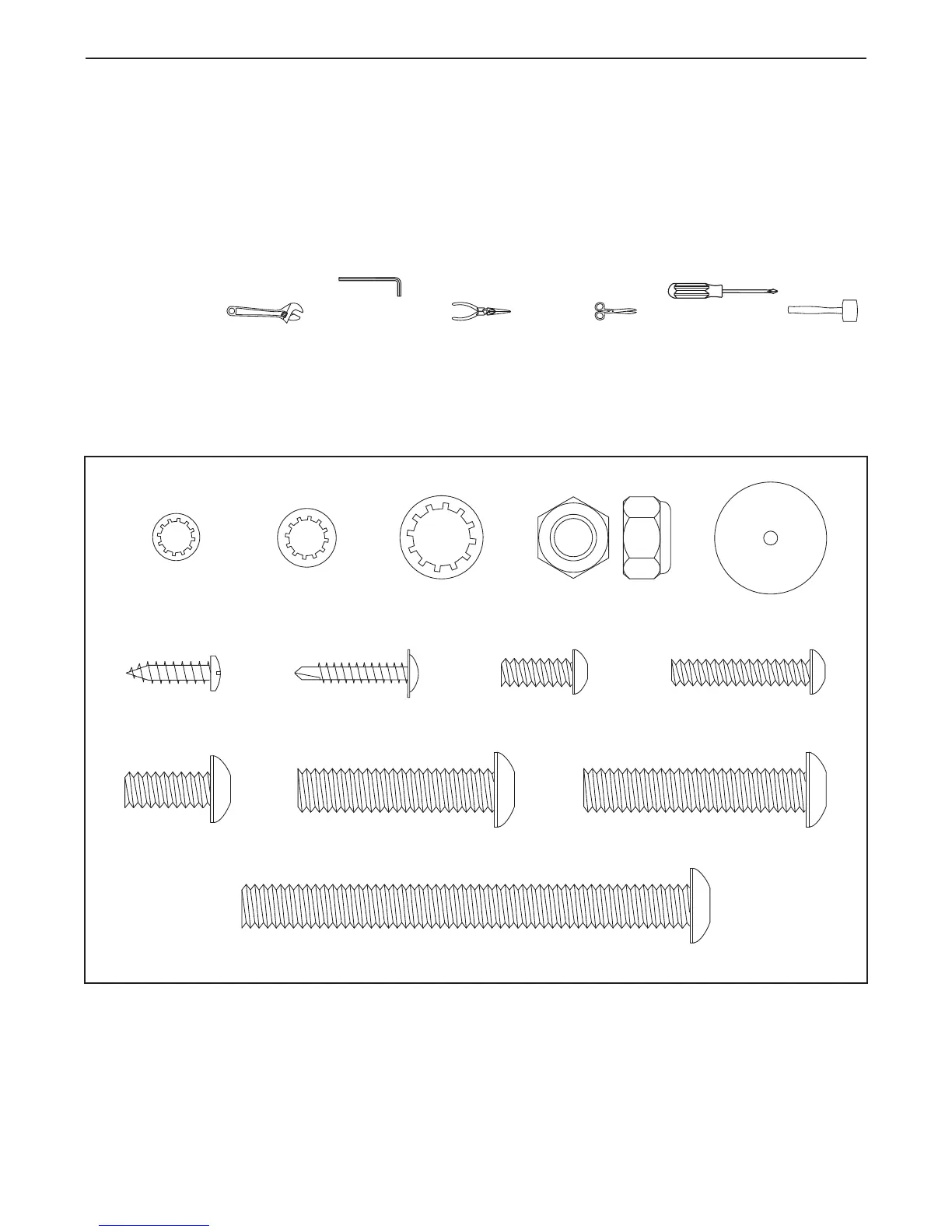Use the drawings below to identify the assembly hardware. The number in parentheses below each drawing is
