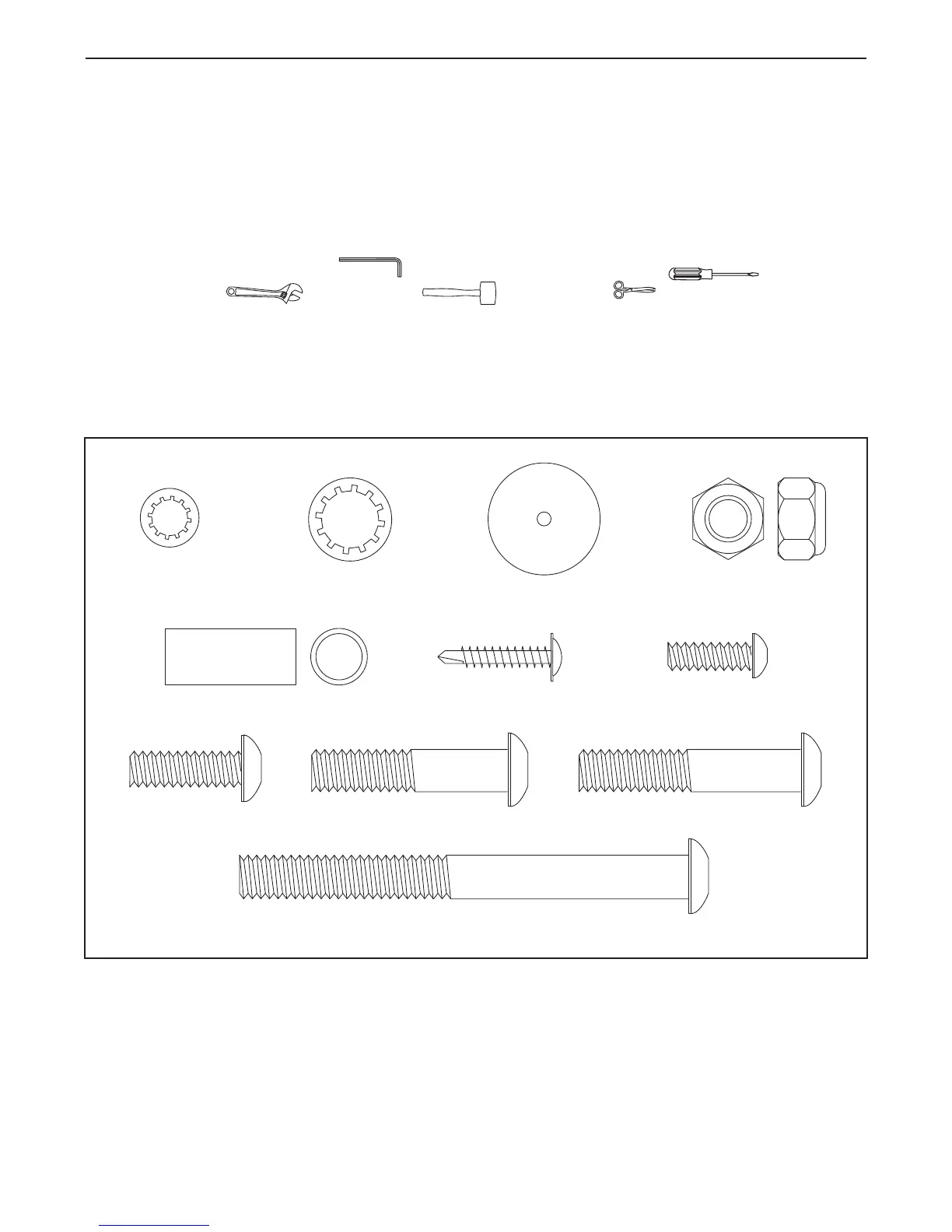 Use the drawings below to identify the assembly hardware. The number in parentheses below each drawing is