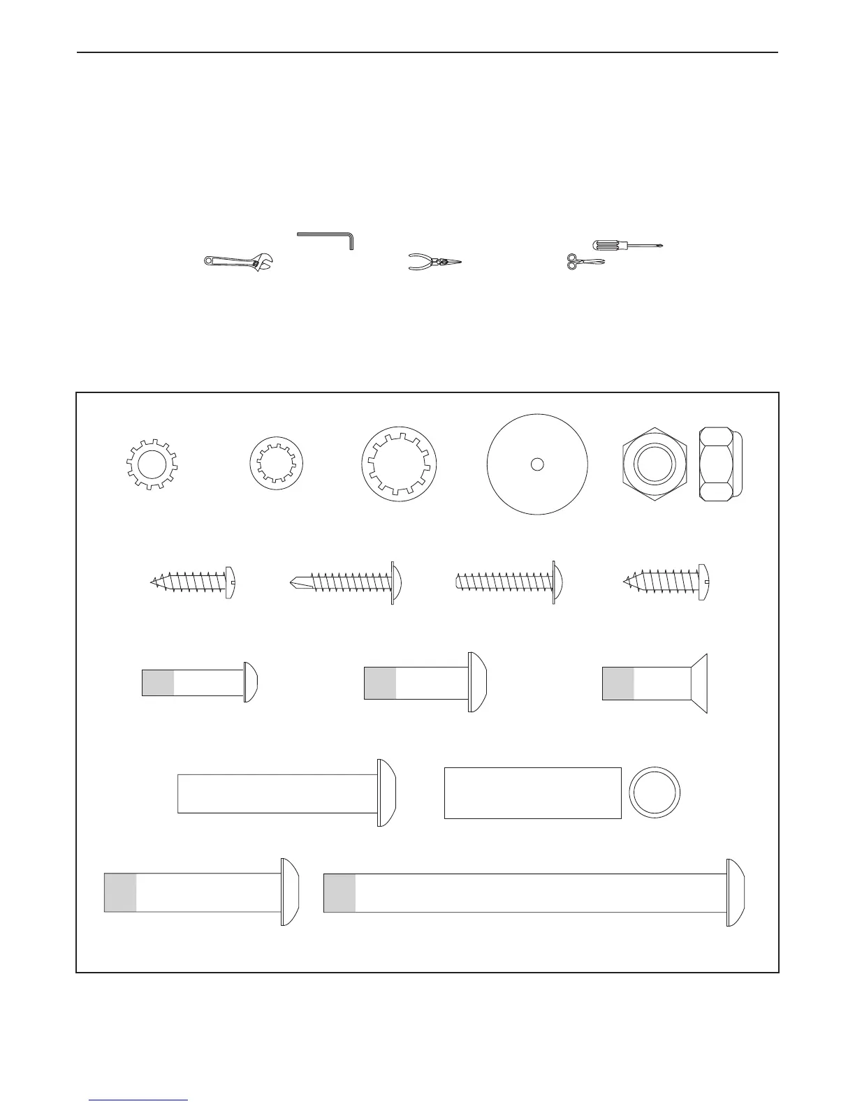 Use the drawings below to identify the assembly hardware. The number in parentheses below each drawing is