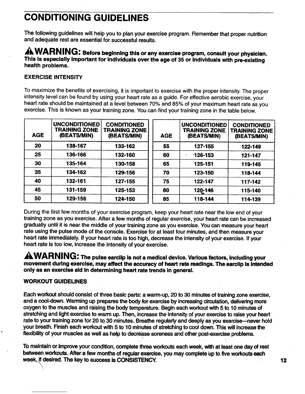 Pro-Form 730 - Conditioning Guidelines; Exercise Intensity; Workout Guidelines