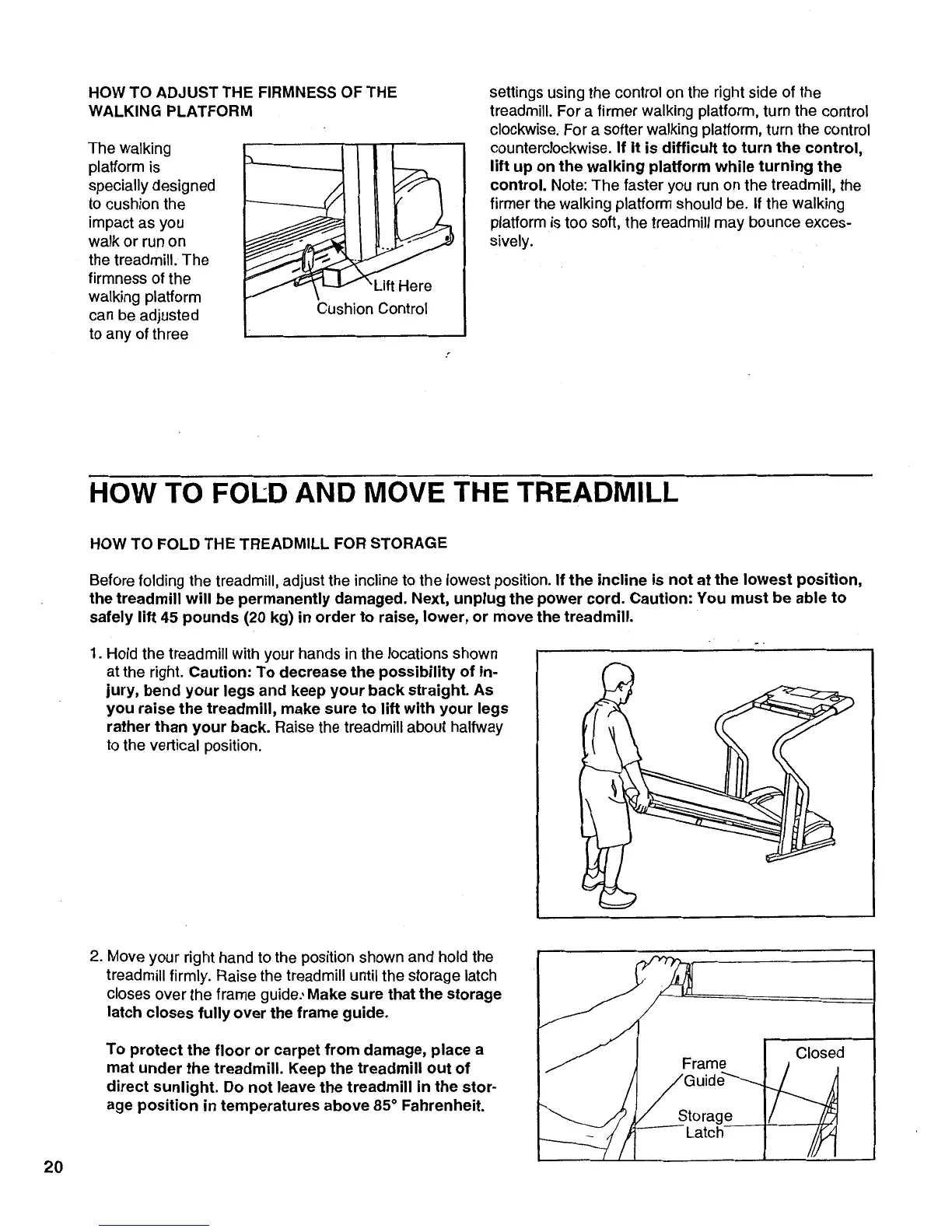 Pro-Form 785 Treadmill - How to Fold and Move the Treadmill; How to Adjust the Firmness of the Walking Platform