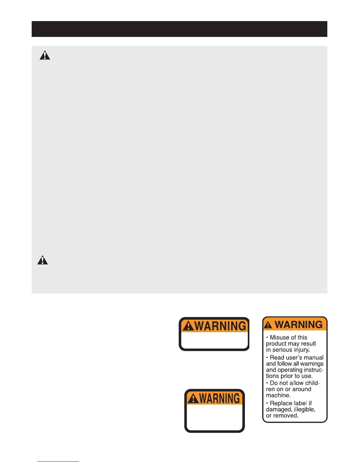The warning decals shown at the right have