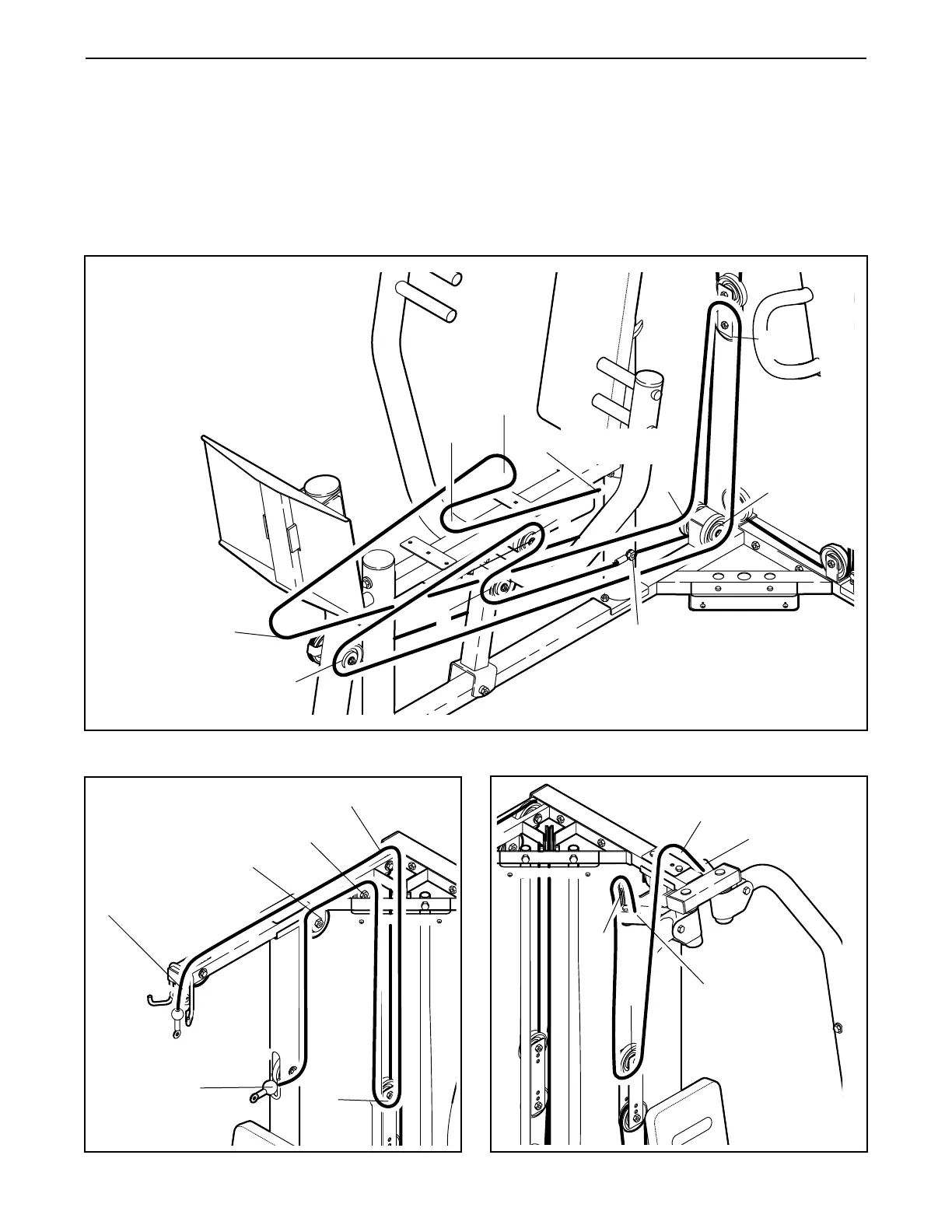 The cable diagrams on this page and the next page show the proper routing of the Leg Press Cable (75), the Ab