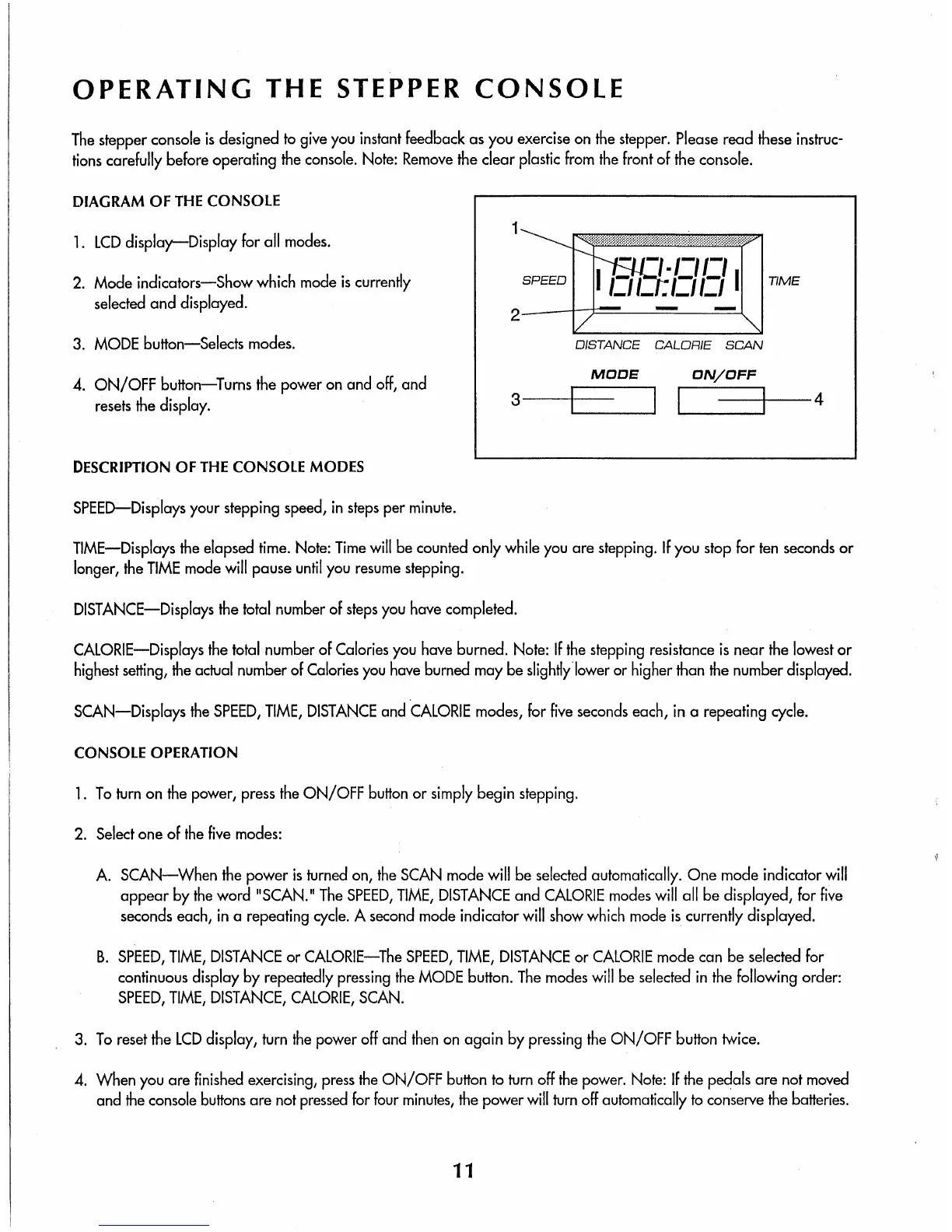 Pro-Form Cross Trainer - Operating the Stepper Consoler; Diagram of the Console; Description of the Console Modes; Console Operation