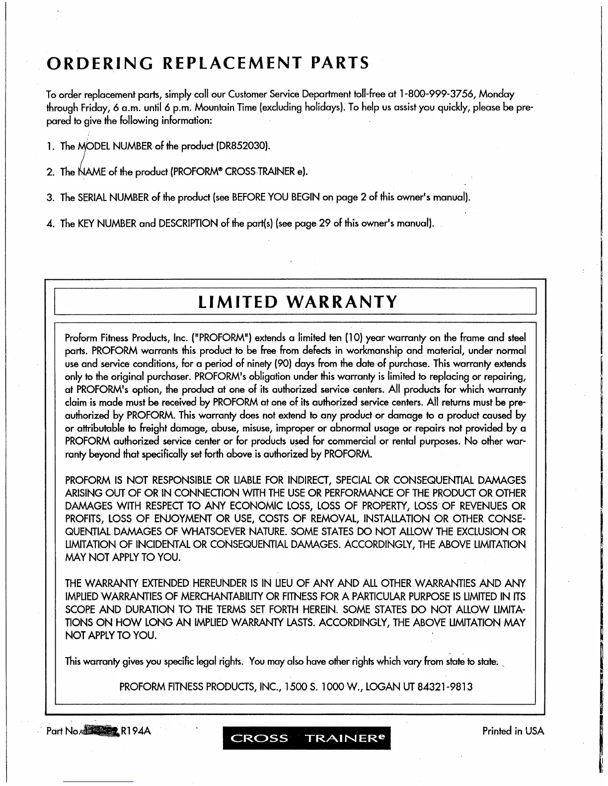 Pro-Form Cross Trainer - Ordering Replacement Parts