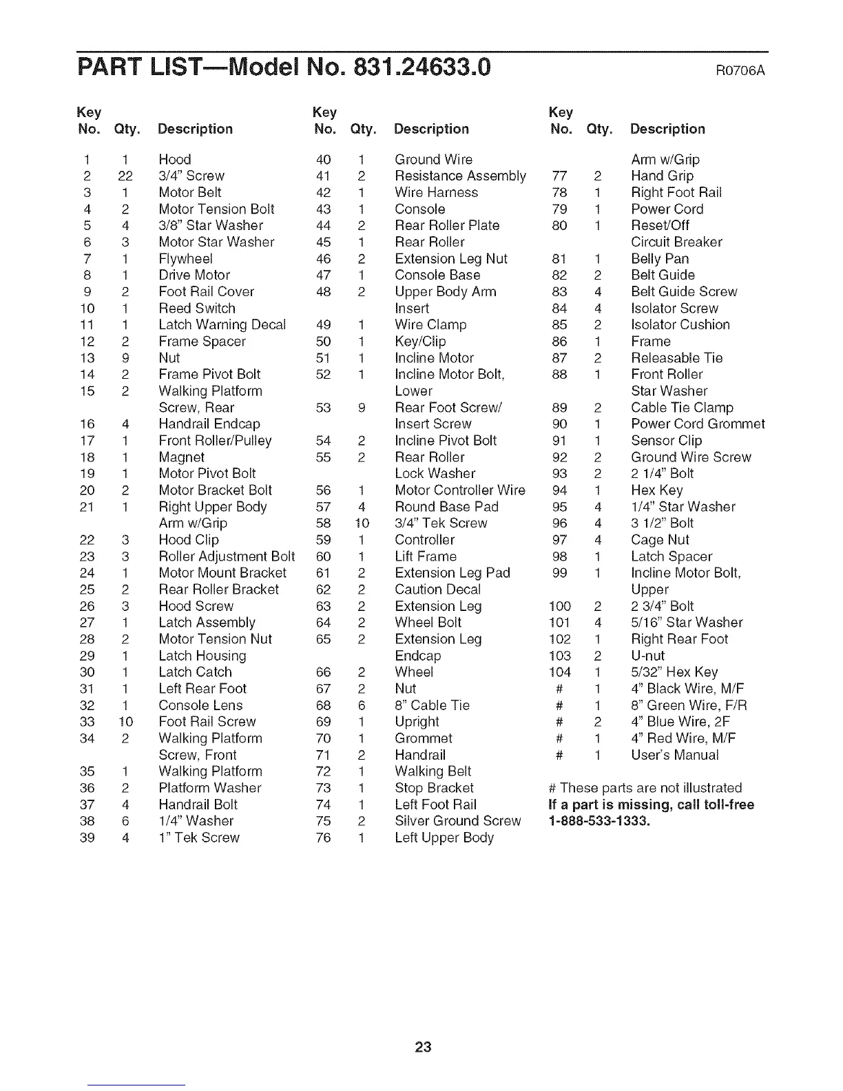 PART LIST--Model No. 831.24633.0 R0706A