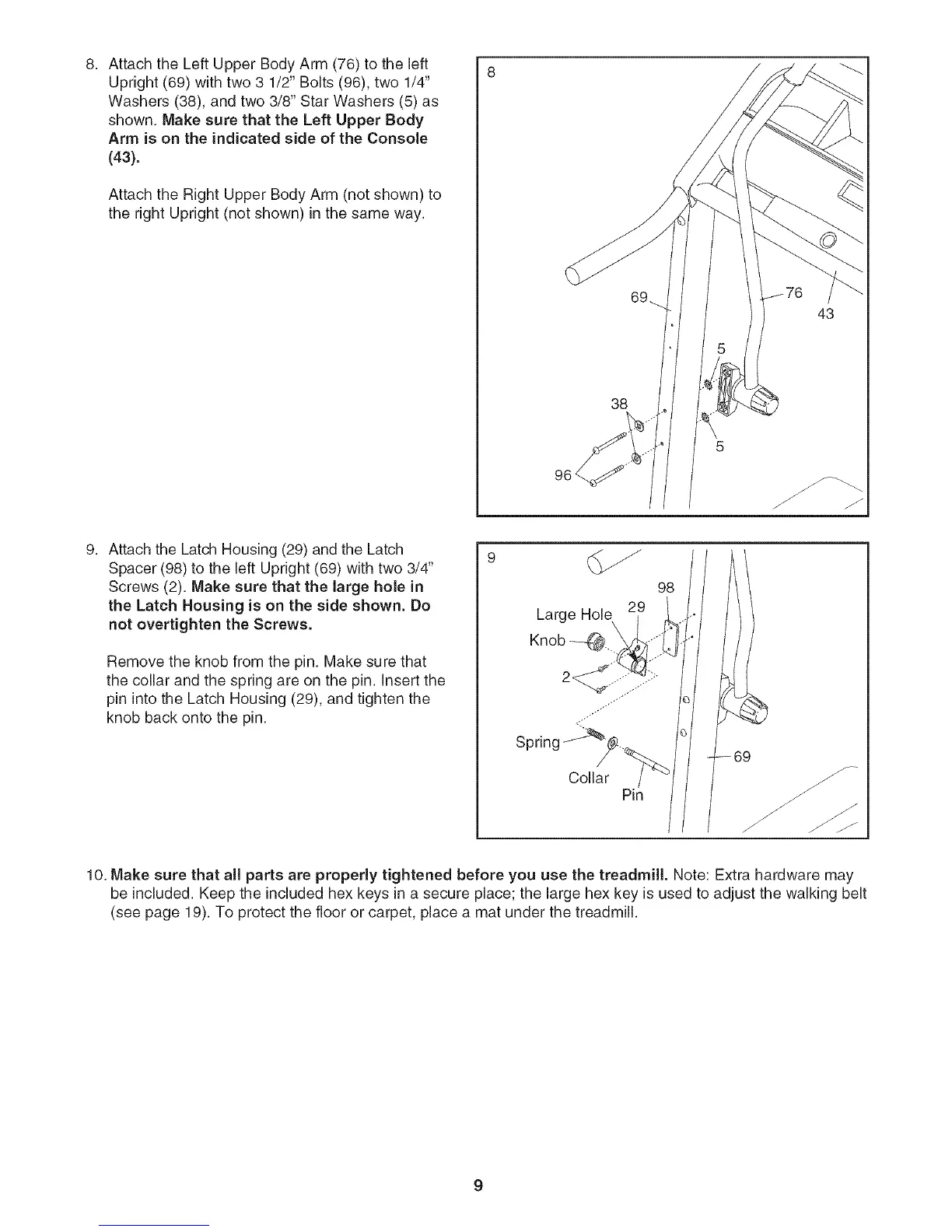 10. Make sure that all parts are properly tightened before you use the treadmill. Note: Extra hardware may