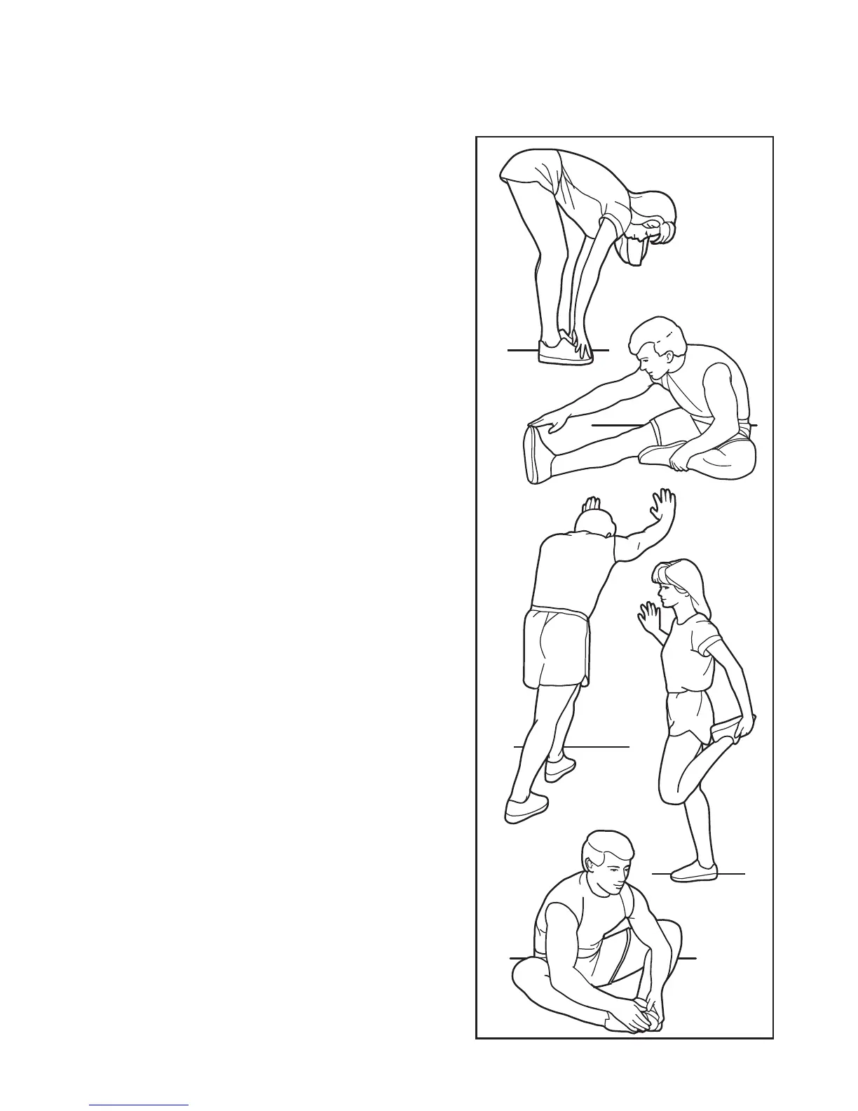 The correct form for several basic stretches is shown at the right. Move slowly as you stretch—