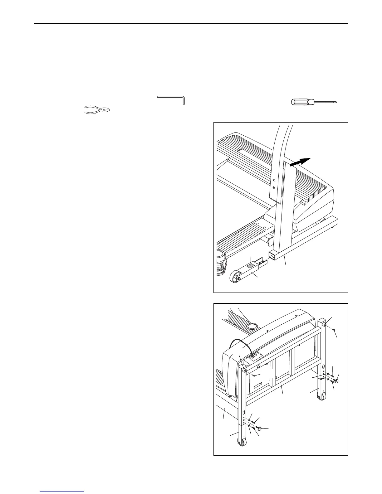 Assembly requires two persons. Set the treadmill in a cleared area and remove all packing materials. Do not